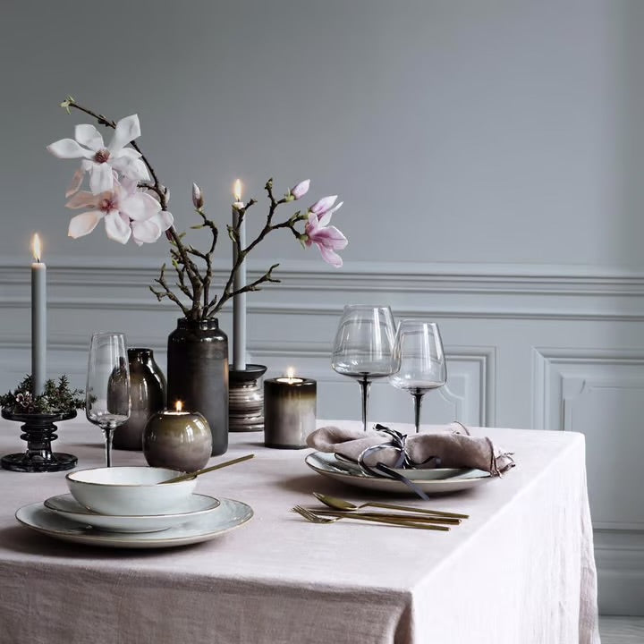 Den munnblåste Smoke-serien fra Broste Copenhagen med sin gradient røykeffekt gir glasset en følelse av eleganse og raffinement, samtidig som den fremhever drikken inni. I enhver borddekking introduserer Smoke-serien en moderne eleganse og visuell spenning. Det unike utseendet er et vitnesbyrd om ferdighetene innen munnblåst glassproduksjon og løfter måltidet.