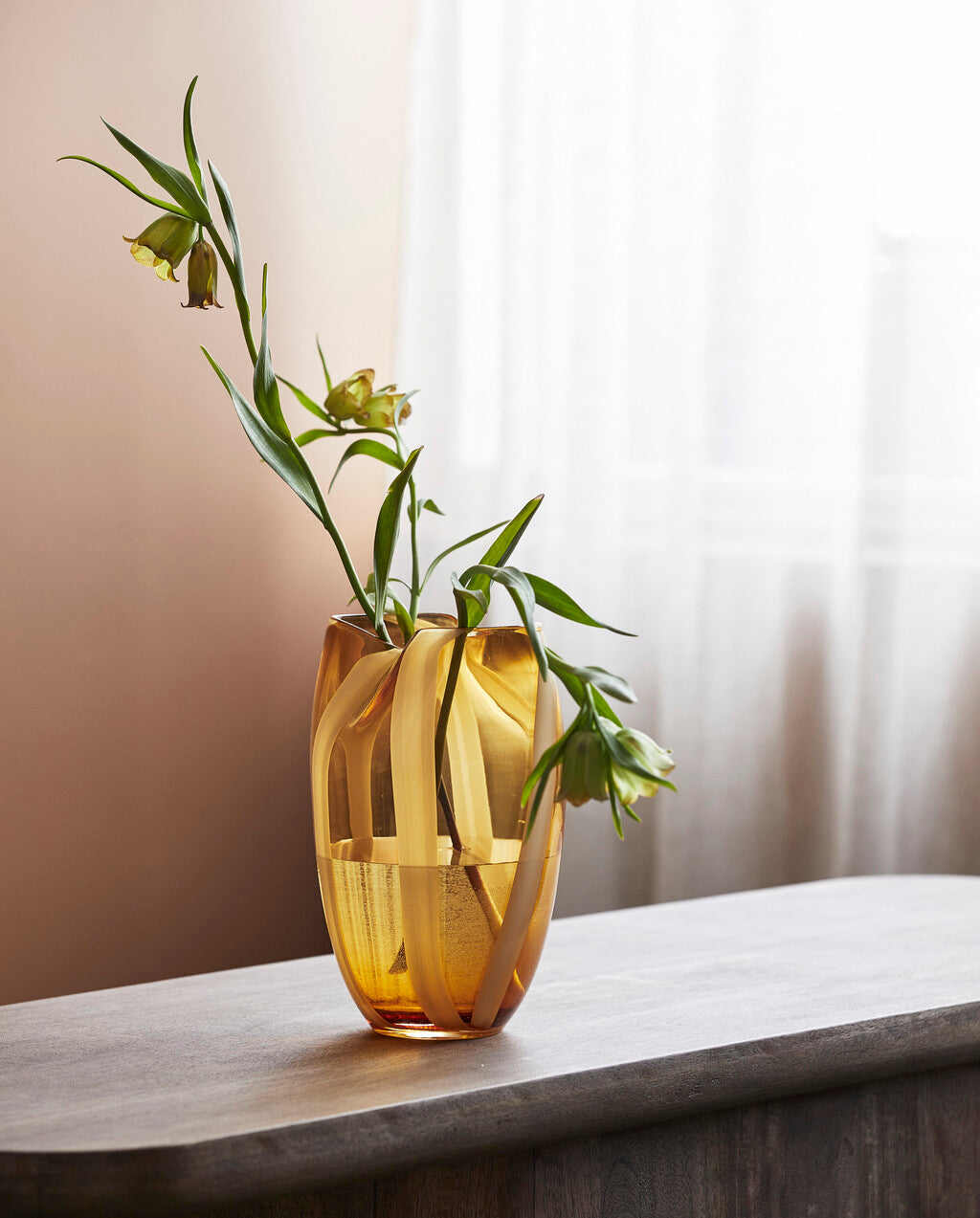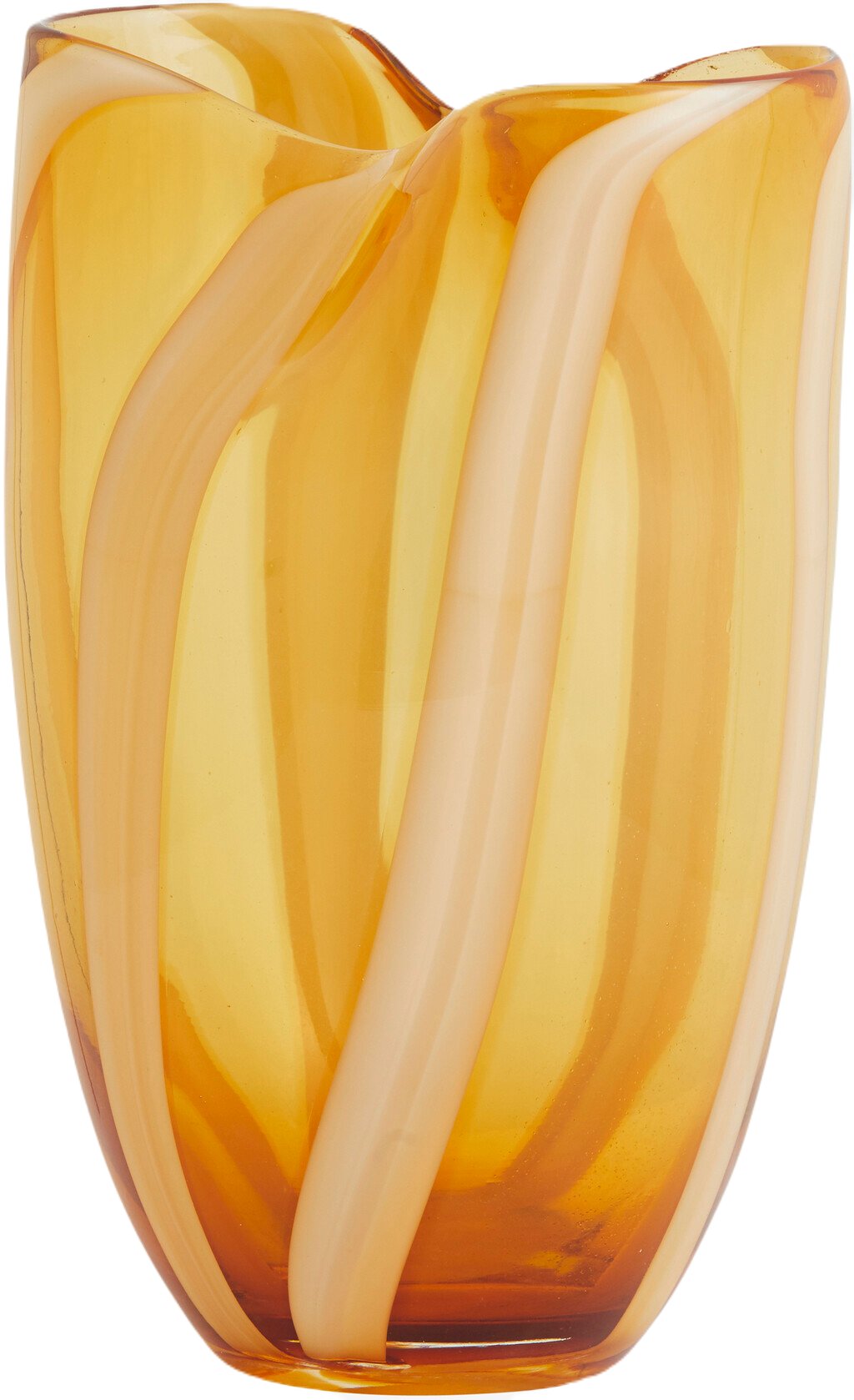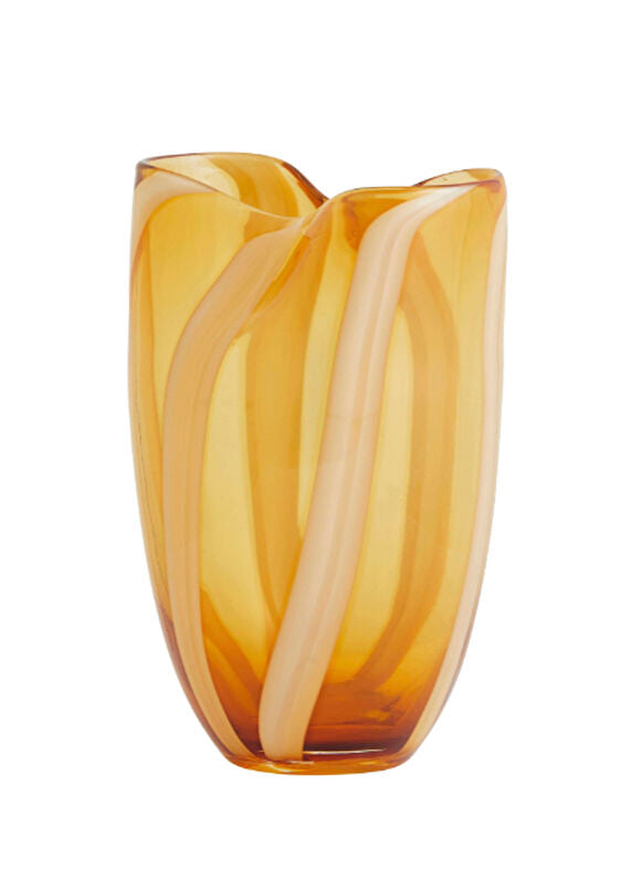 Den vakre vasen HALKI er en dekorativ glassvase med et håndmalt stripete mønster i rav og hvit. Bruk vasen til blomster, grener eller som et dekorativt element i interiøret.