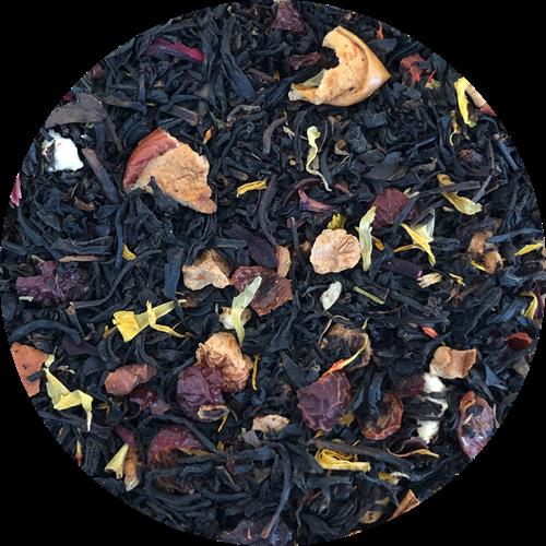 Ingredienser: sort te, eplebiter, nypeskall, hibiskus, aroma, sitrusskall, ringblomstkronblader, safrantistelkronblader, bourbonvaniljeekstrakt.