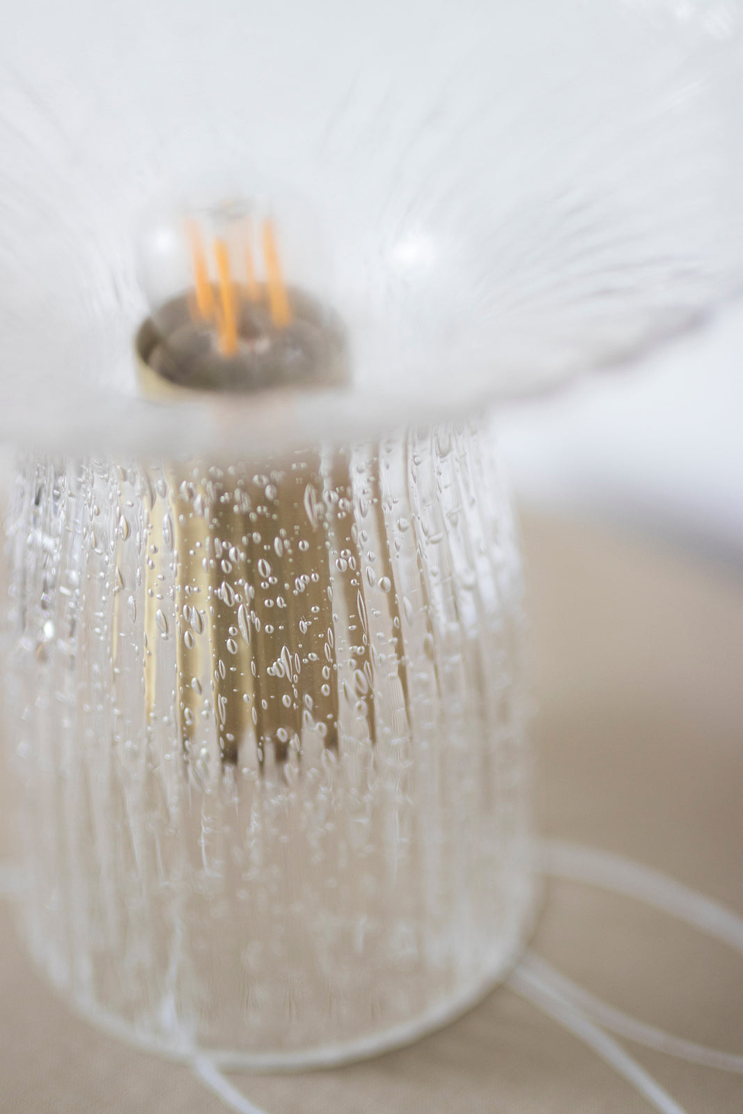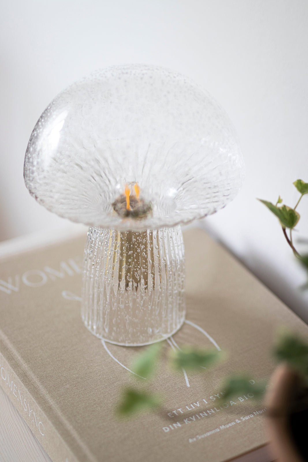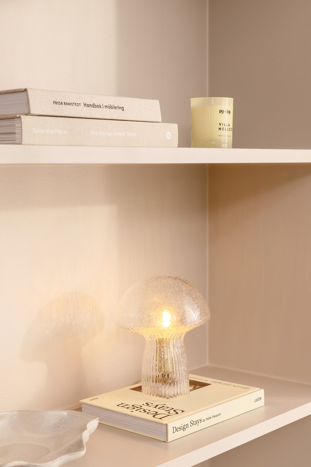Inspirert av skogen kommer denne lille bordlampen avbildet som en sopp. Den er laget av klart glass med rifler på foten hvor riflene går helt opp under hatten som skivene på en agarikksopp. Lampen har mange flotte små luftbobler i glasset som gir et behagelig uttrykk når lyset er på.