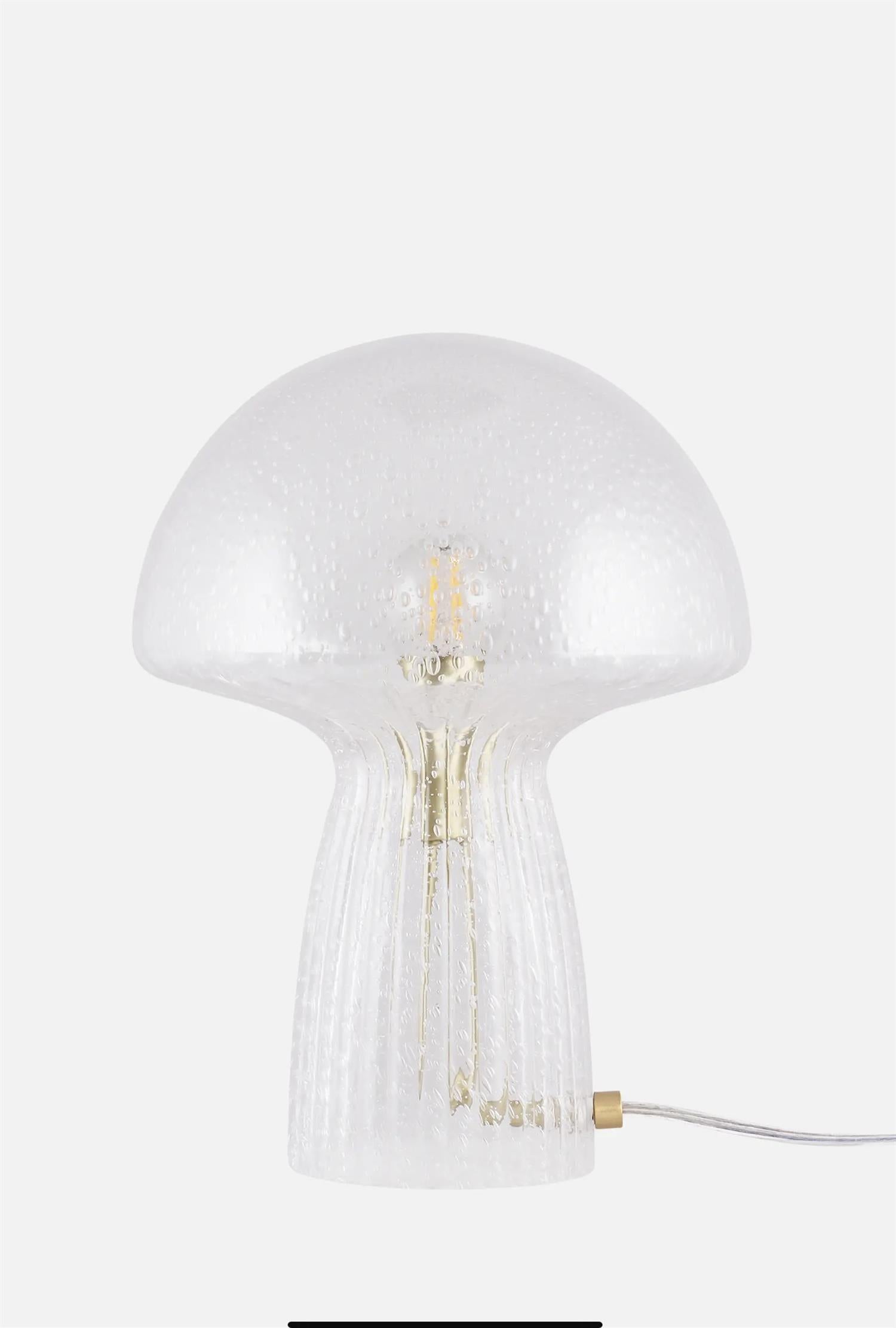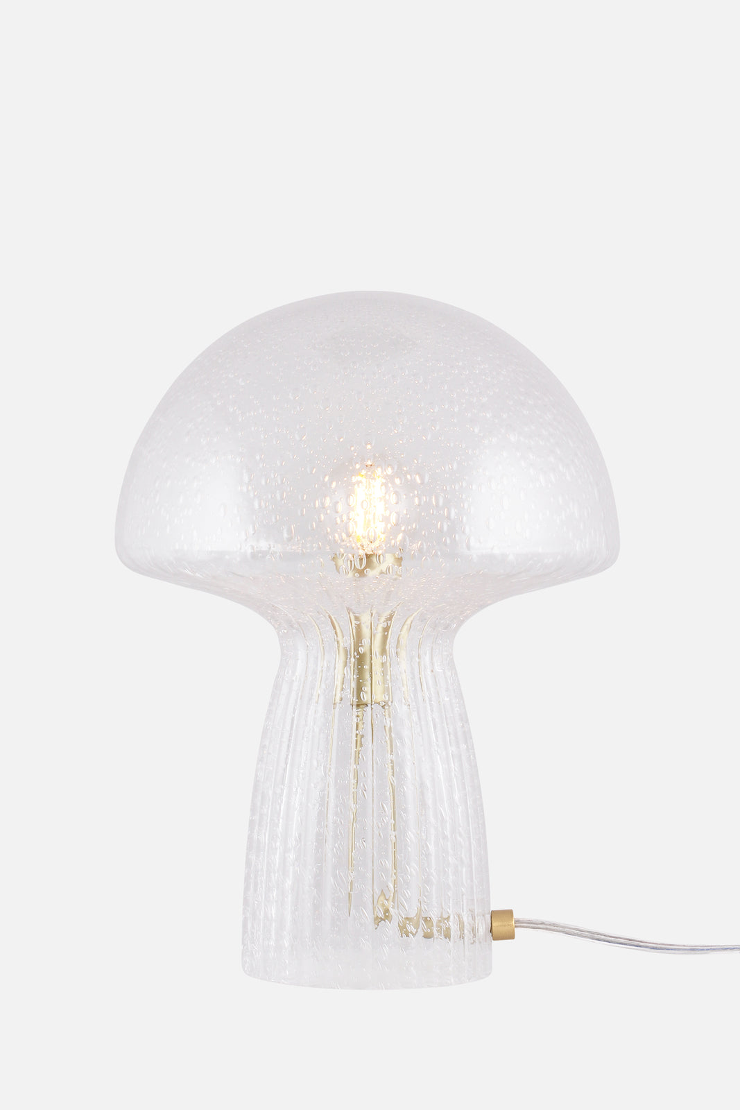 Inspirert av skogen kommer denne lille bordlampen avbildet som en sopp. Den er laget av klart glass med rifler på foten der riflene går helt opp under hatten som skivene på en agarikksopp.
