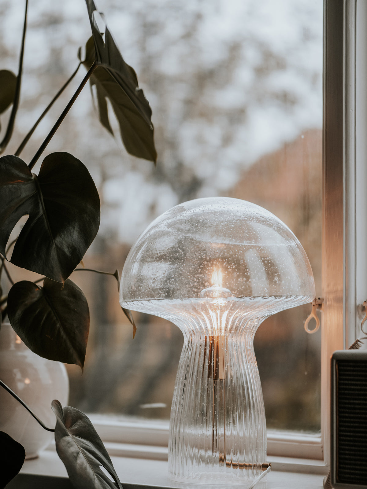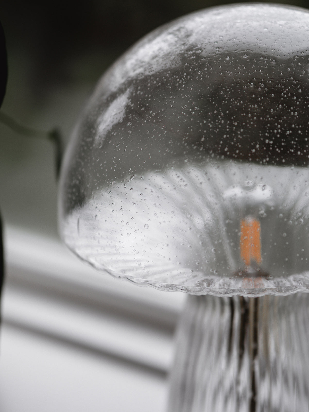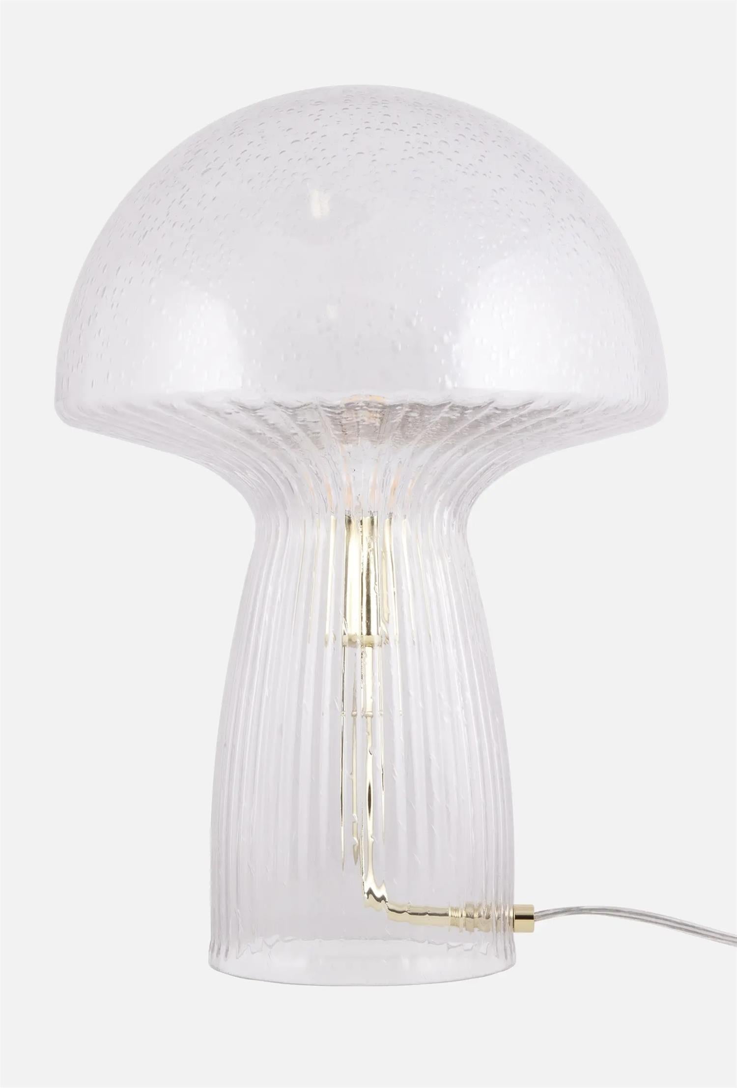 Inspirert av skogen kommer denne bordlampen avbildet som en sopp. Den er laget av klart glass med rifler på foten og hvor riflene går helt opp under hatten som skivene på en agarikksopp. Lampen har også vakre små luftbobler i glasset.