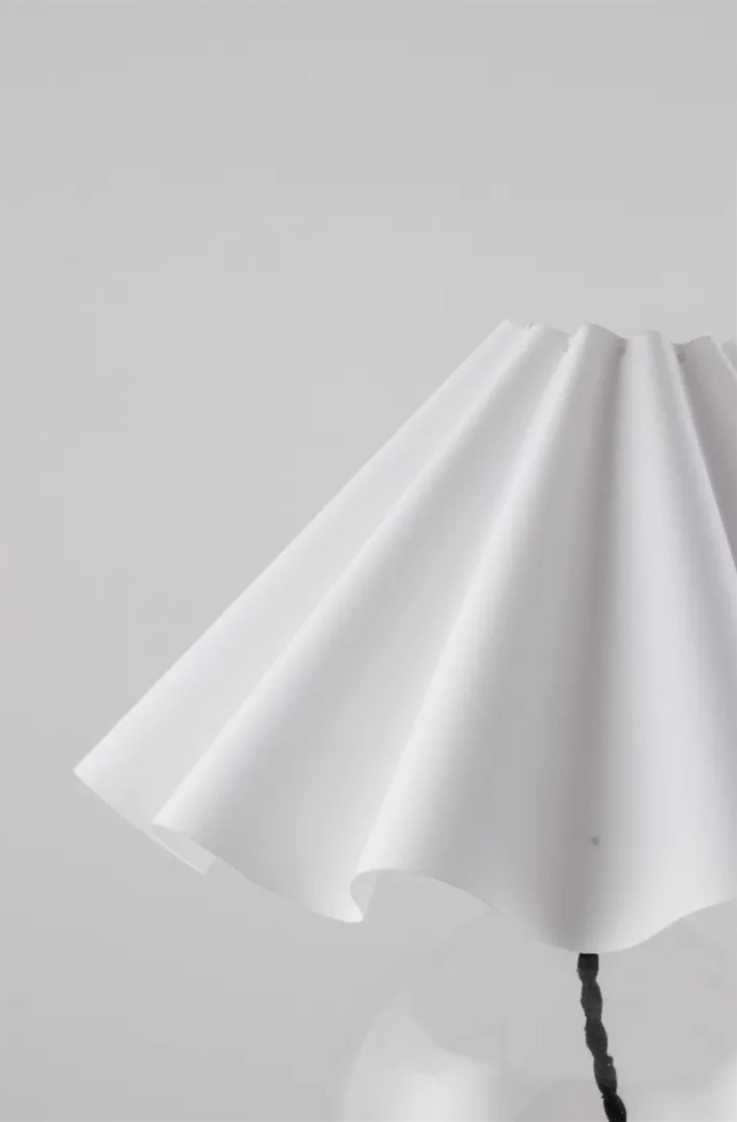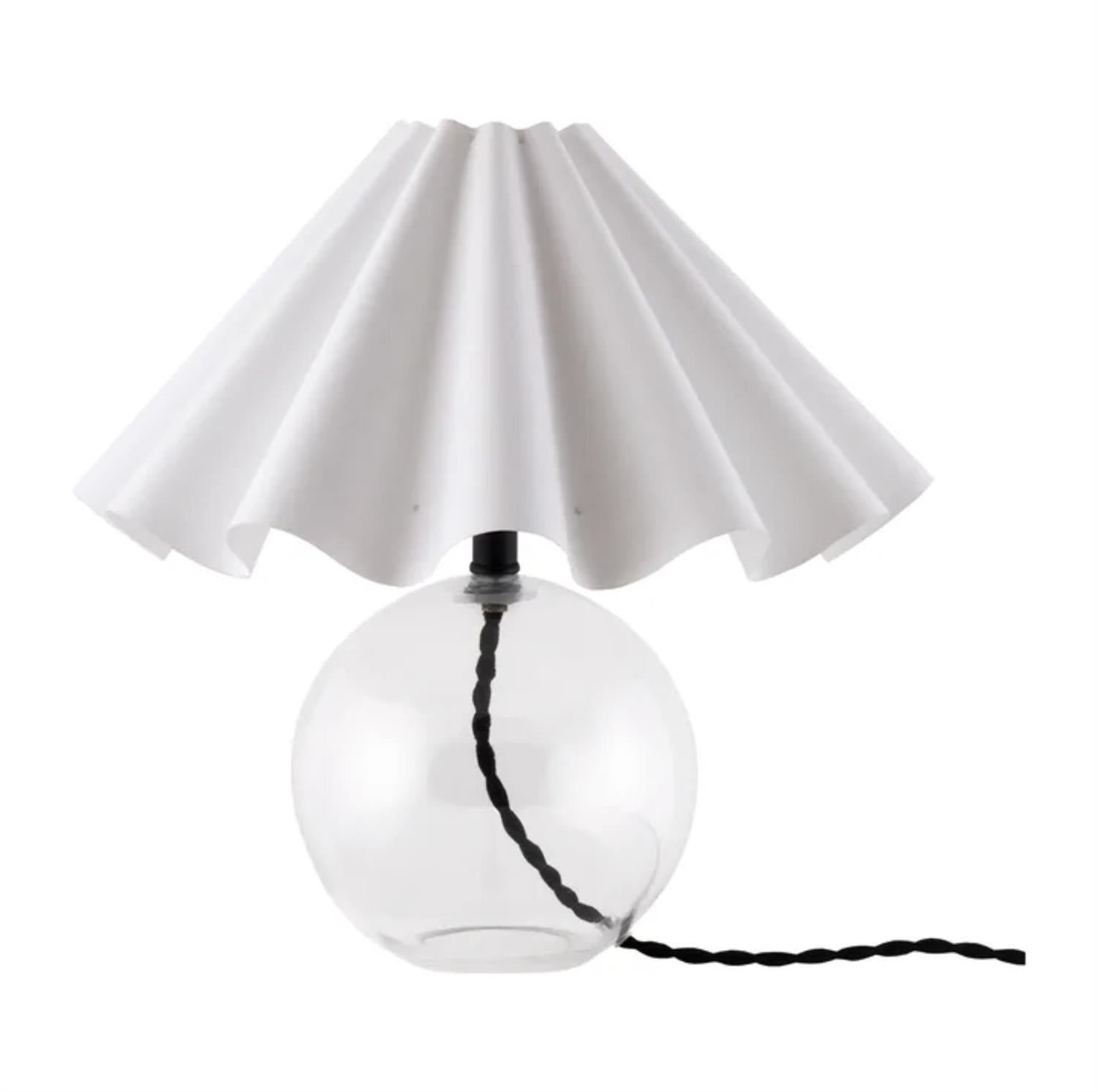 Judith er en klassisk bordlampe med en moderne touch. Lampens base er laget av klart glass og den hvite lampeskjermen i tekstil blir en dekorativ detalj med sin bølgende form. Lampen har en 120 cm lang svart vridd tekstilledning med bryter og stikkontakt.