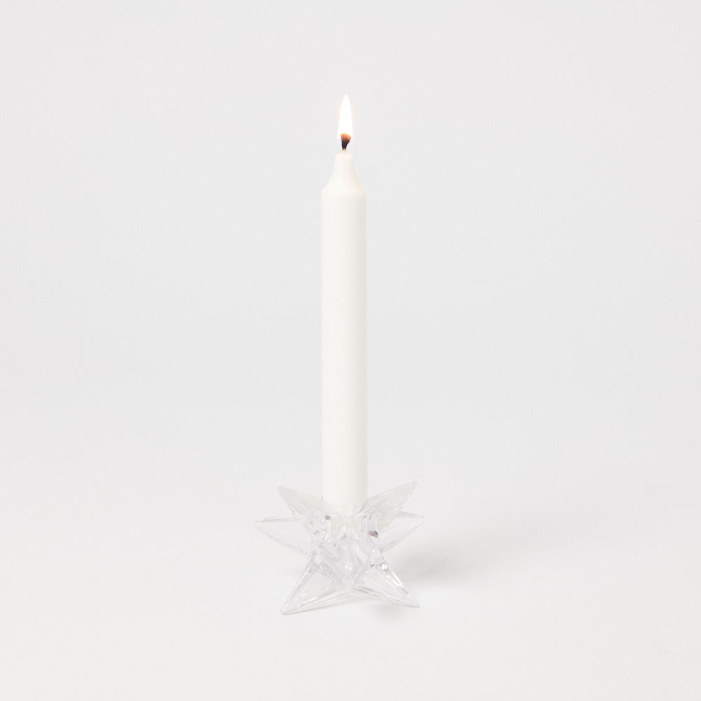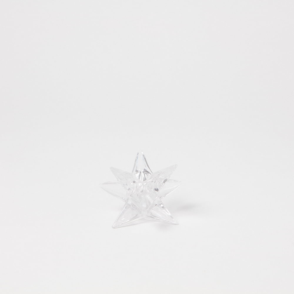 Vakker lysestake i klart glass som er formet som en stjerne. Lysestaken er til kronelys og kommer for telys.