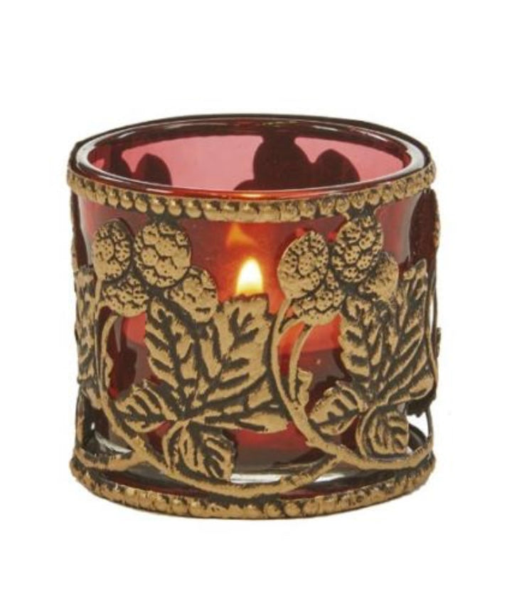 Lekker telysholder i burgunder rød og gull metall med filigran mønster fra Goodwill.