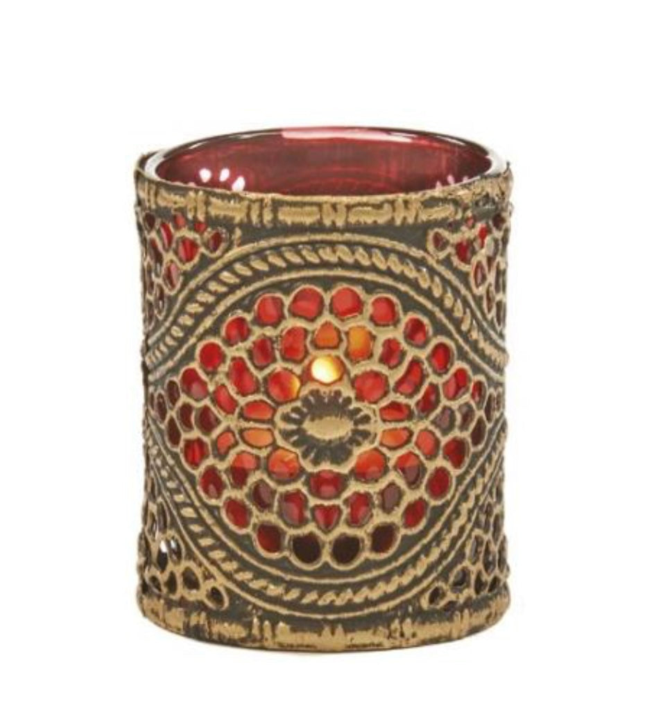 Lekker telysholder i burgunder rød og gull metall med filigran mønster fra Goodwill.
