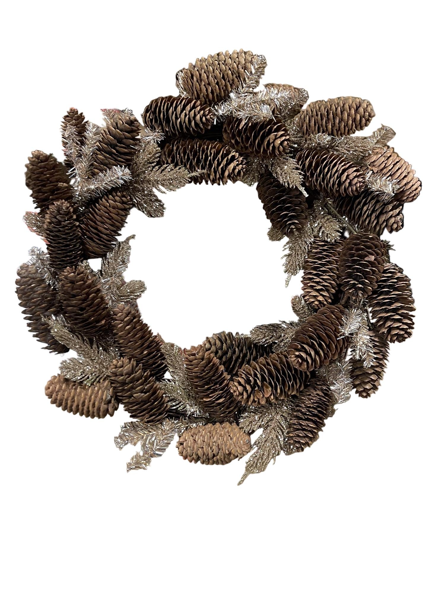 Herlig dørkrans med kongler fra Shishi i champagne farge til jul.
