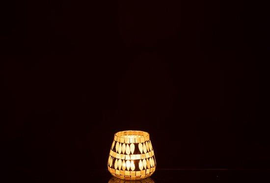Vakker telysholder fra J-line i glass med gull mosaikk som gir et vakkert lys.