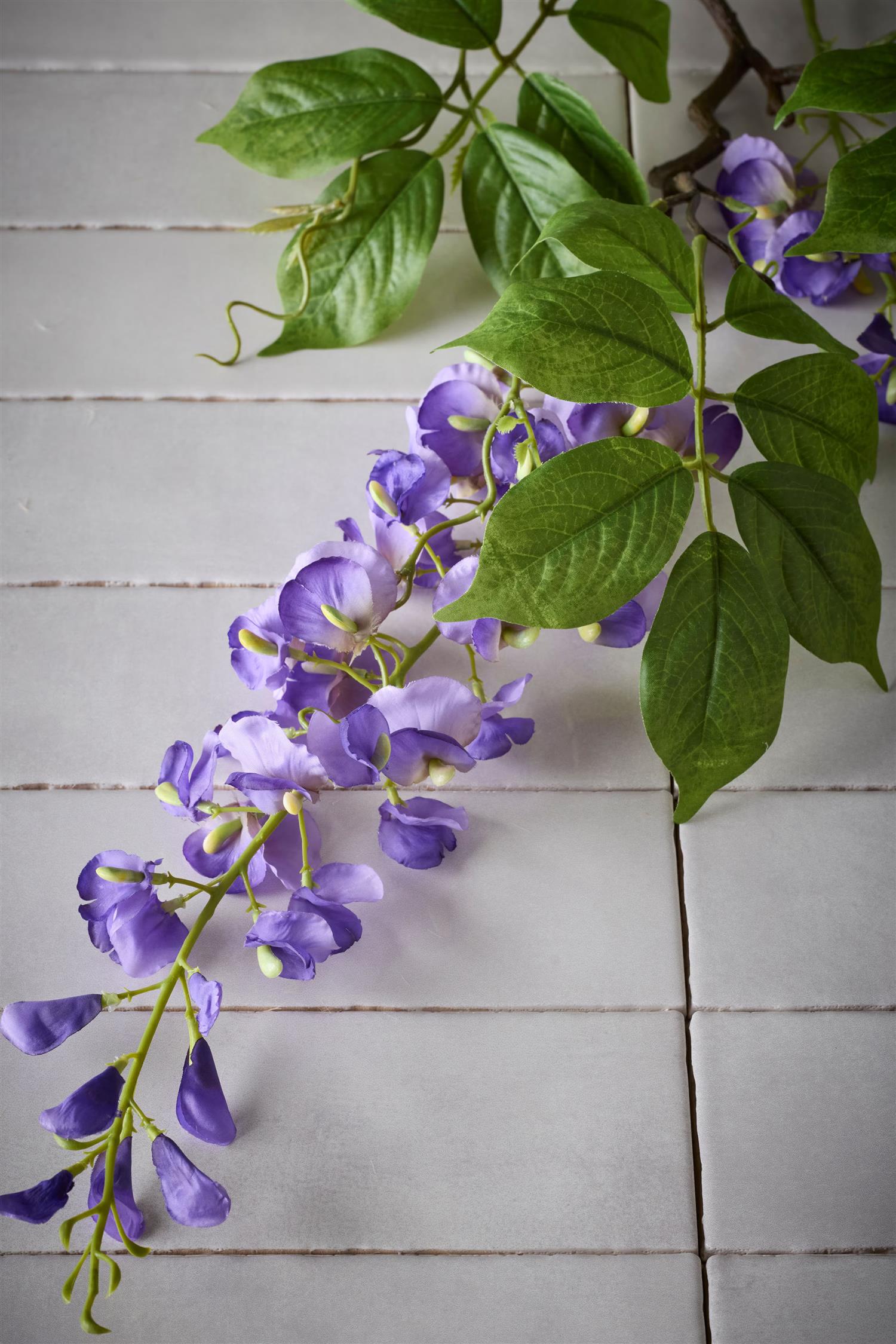 Elegant kunstig visteria/blåregn i lilla på 100 cm fra Mr Plant. Den vakre blåregnen er lekker i en vase eller krukke og er helt vedlikeholdsfri. Bruk den alene eller flere sammen for en slående effekt som ser helt ekte ut.
