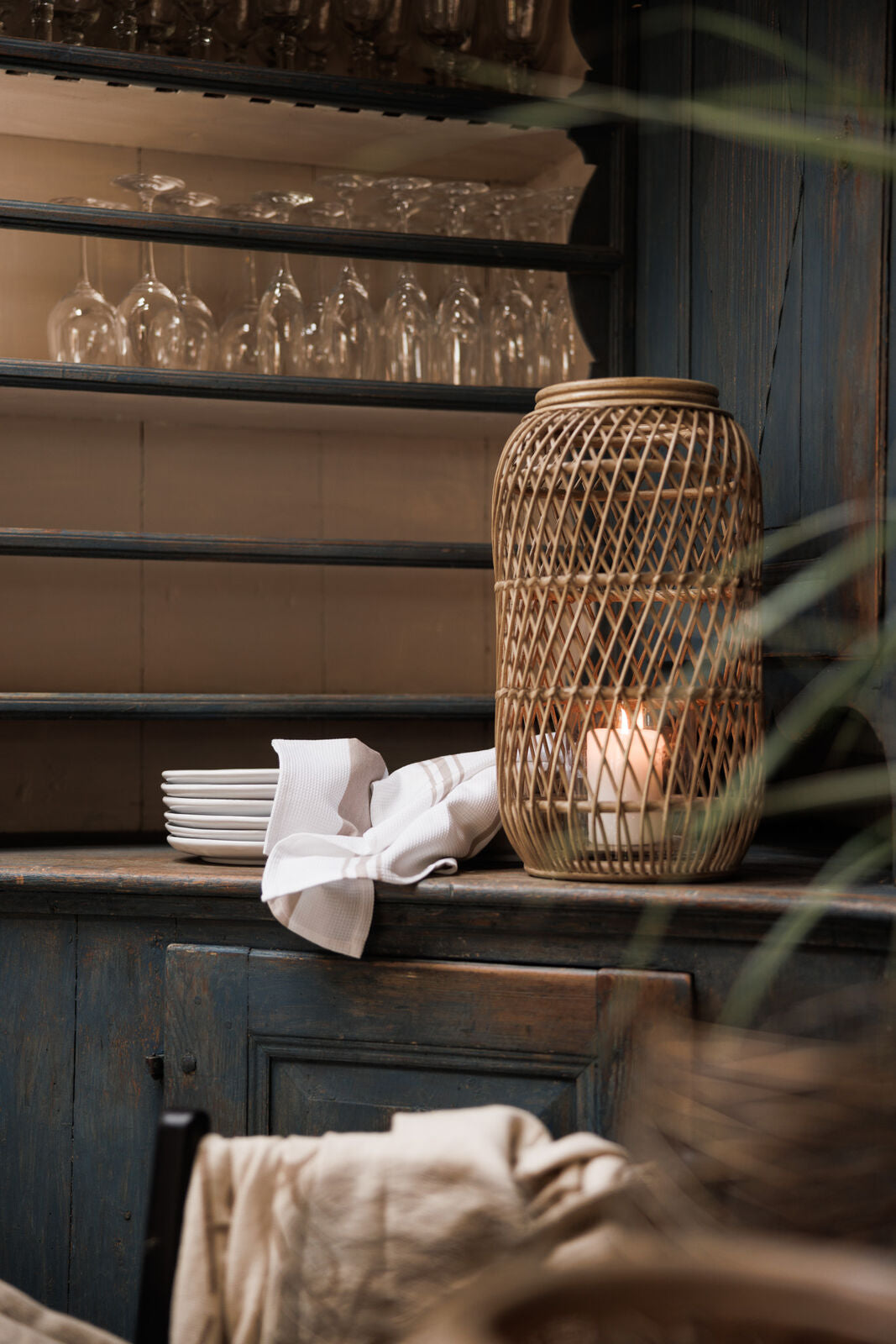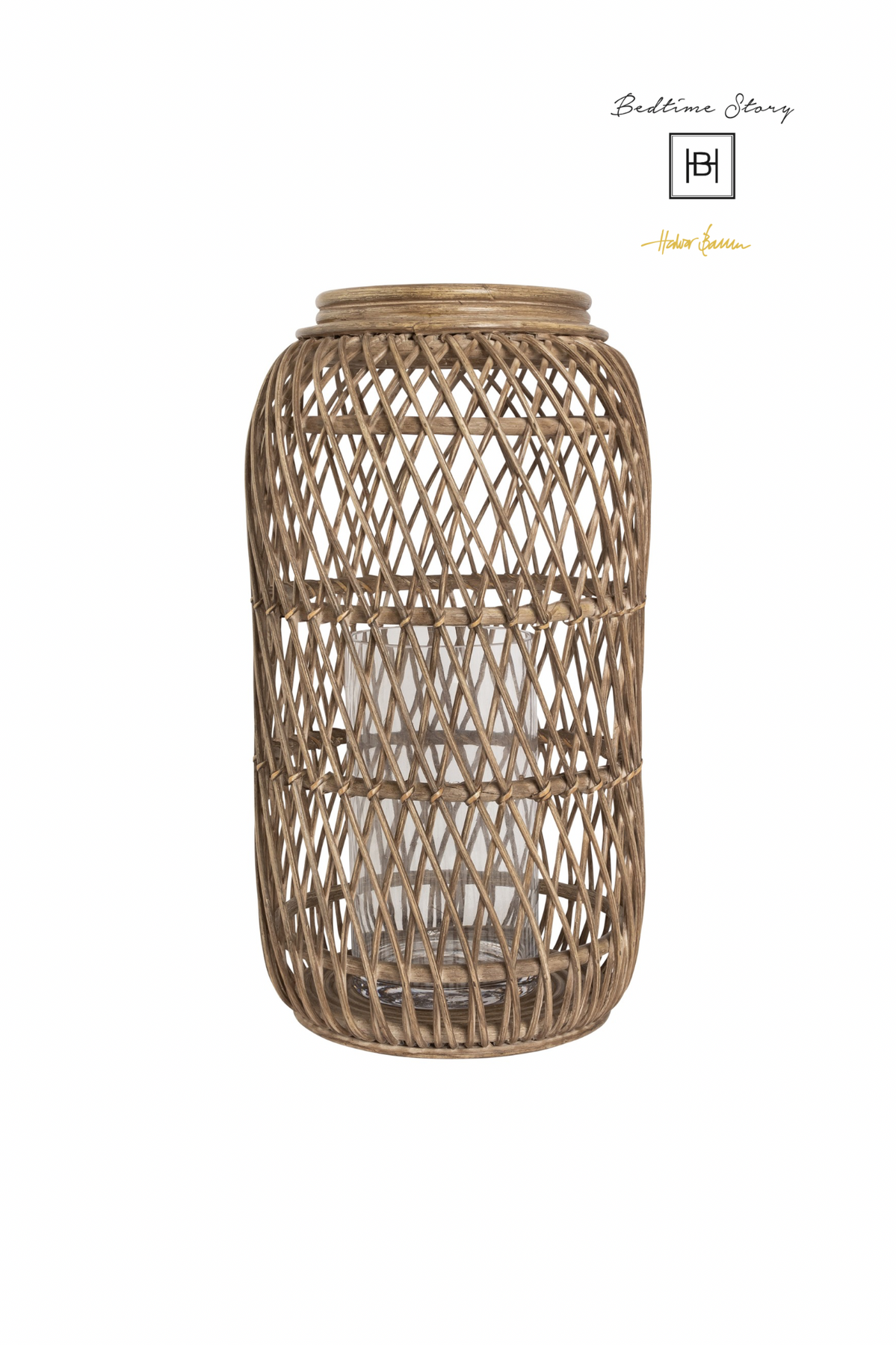 Høy og smal lyslykt Lombok fra Lama i lys, naturfarget flettet rotting med sylinder i glass til telys eller kubbelys.