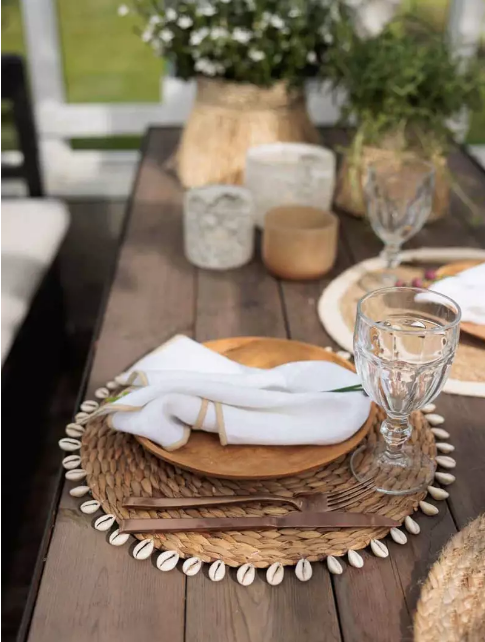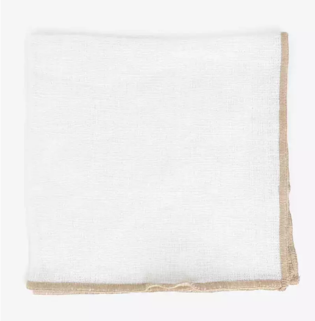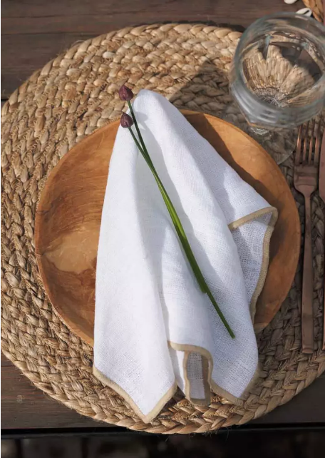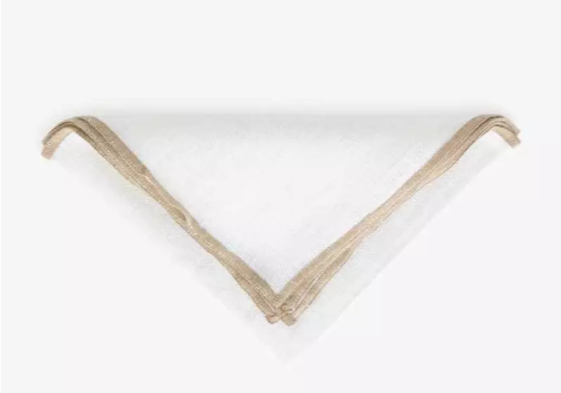 Klassisk tøyserviett Montebaldo fra Lama i grov, hvit lin med en dekorativ beige overlock-kant. En stoffserviett kan brukes både til hverdags og til fest, og lin er et solid naturmateriale som tåler både vask og bruk.